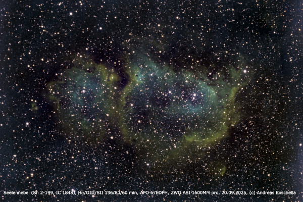 Der Seelennebel ist ein Emissionsnebel im Sternbild Kassiopeia, wobei die IC-Nummer den eingebetteten Sternhaufen bezeichnet. Das Objekt ist ca. 7500 Lichtjahre von der Erde entfernt und nimmt eine Fläche von 150' x 75' ein.