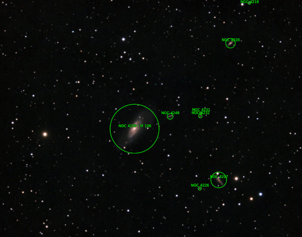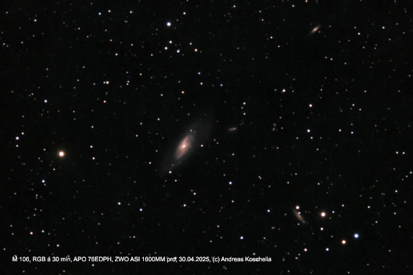 M106 ist eine Spiralgalaxie im Sternbild Jagdhunde mit einer Größe von 18,6' x 7,2'. Sie wurde 1781 von Pierre Méchain entdeckt. (Quelle: https://de.wikipedia.org/wiki/Messier_106) |