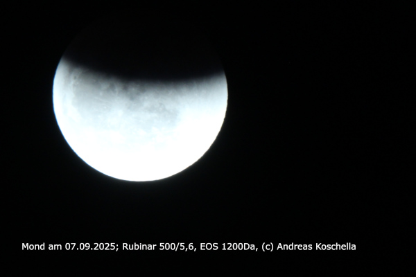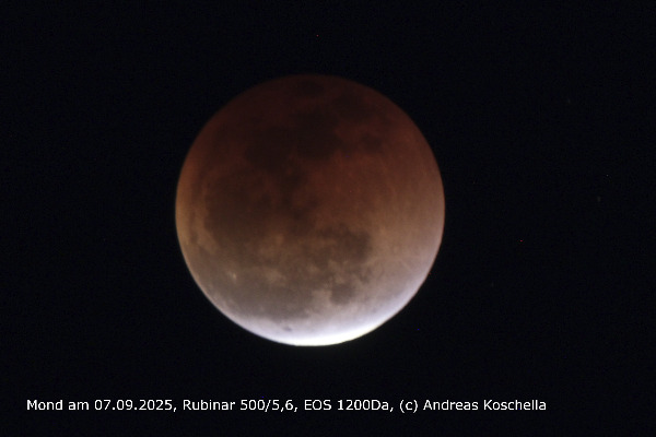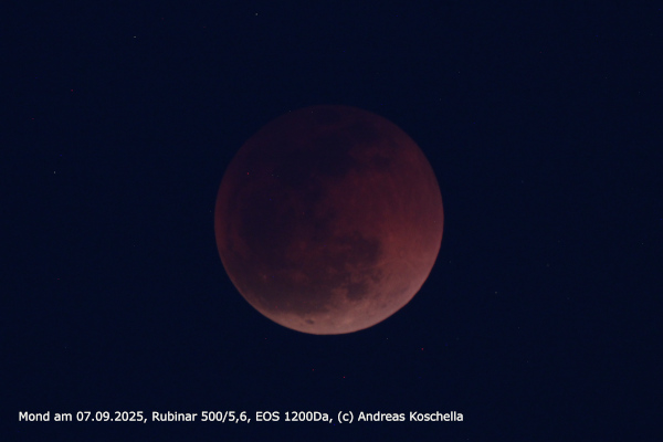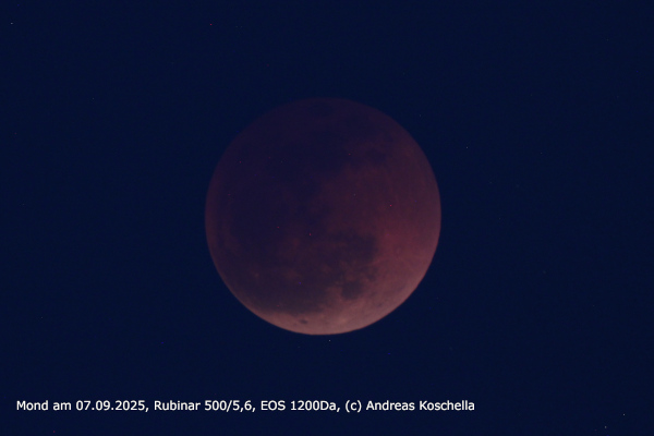 Am Abend des 07.09.2025 fand eine totale Mondfinsternis statt. Da der Mond bereits in der Totalitätsphase aufging, musste ein Standort mit guter Sicht zum Südosthorizont aufgesucht werden.